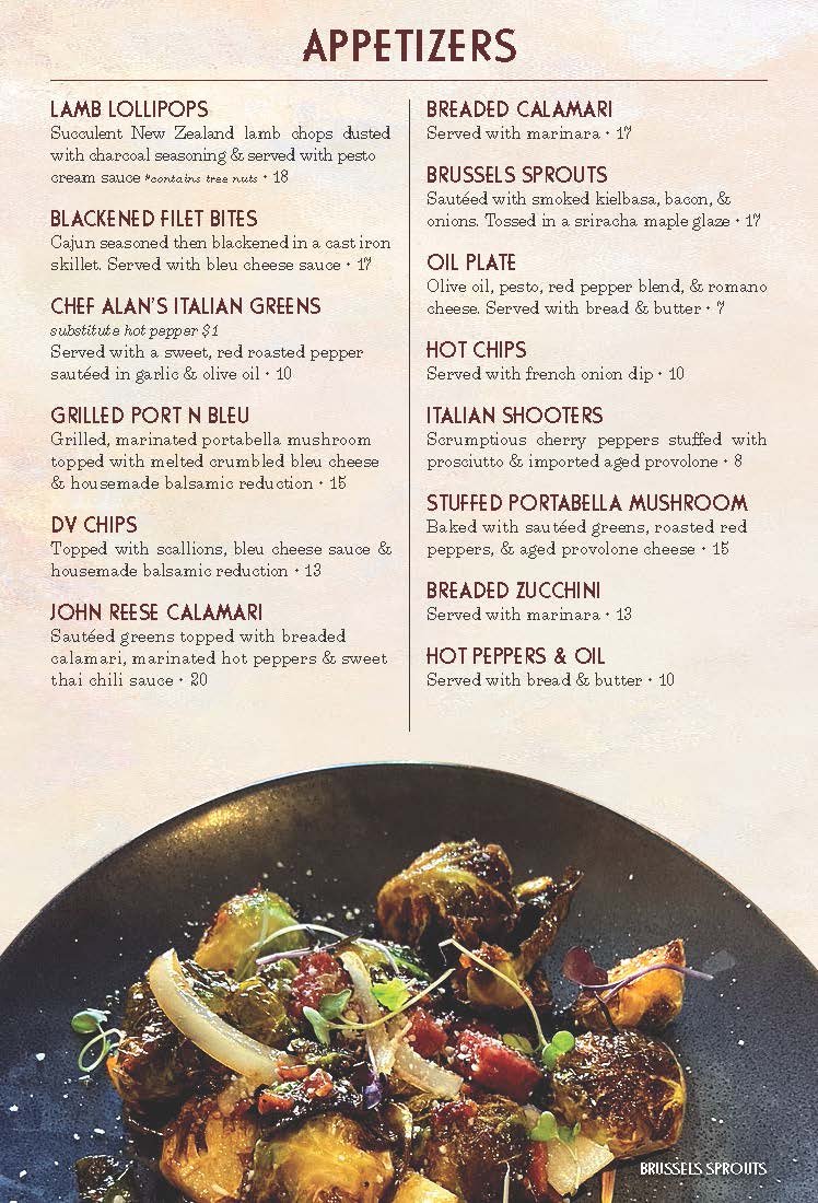 Our charming restaurant offers spacious seating and a full bar. You can choose from a wide variety of appetizers including everything from our Homemade Hot Peppers in Oil, to our Three Cheese Garlic Bread.