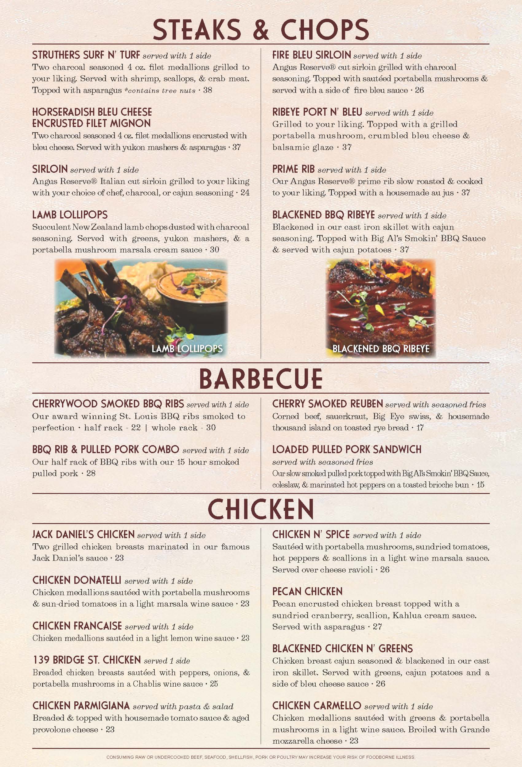 House specials include our delicious Breaded Walleye, Shrimp and Greens, Baby Back Ribs, and Fire Bleu Filet.